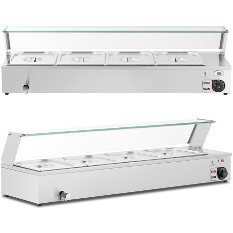 4 x gn 1/2 (4 x 4,7 l) To vám umožní ohrozit několik různých jídel najednou. Zařízení lze použít k použití jiných velikostí gn kontejnerů a spojit je dohromady. Bemar byl vyroben z nerezové oceli, je odolný, odolný vůči korozi a hygieninám.