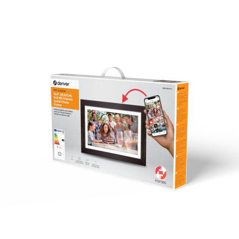 Díky aplikaci FUMO Můžete bezdrátově odesílat obrázky přímo z telefonu a připojení Wi-Fi umožňuje sdílení dětinsky jednoduché. Stylové hnědé pouzdro se hodí ke každému interiéru a univerzální noha umožňuje nastavit rám svisle nebo vodorovně.