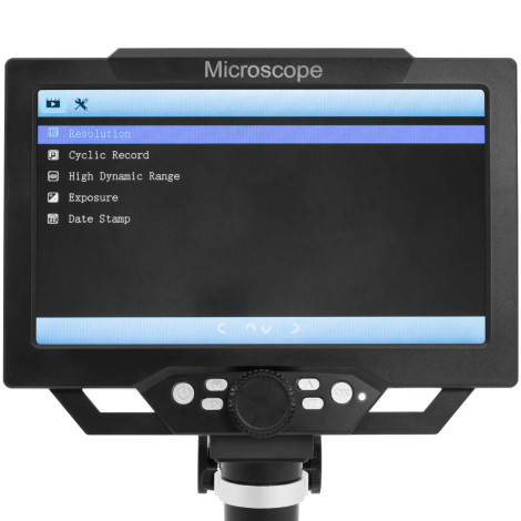 1080 Full HD, 720p a VGADíky, které jsou získány nejvyšší nahrávky kvality. Objekt je zkontrolován v reálném čase na 9 "LCD displeji. Bude ideální pro komplexní výzkum nebo dlouhodobou práci ve vhodné poloze. Monitor a elektronický mikroskop jsou umístěny na vnímivém kovu stojanu na vnímajícím kovem, na kterém je výška fotoaparátu hladce umístěna vzhledem k tomu Objekt. Chcete-li upravit ostrost obrazu, použijte hrubé a přesné nastavení mikroskopu. Když více světelných potřeb, můžete použít jasné světlo z diod umístěných na kovovém stojanu.