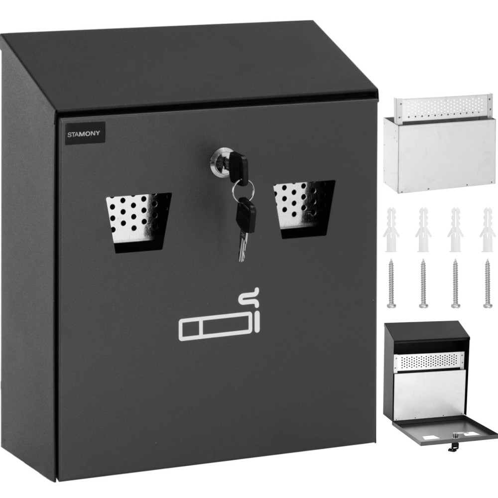 10240083Stamon Wall AshtrayY lavet af koldvalset stål egnet til udendørs brug. Takket være pulverets finish er det modstandsdygtigt over for vejrforhold og rust. Dens store kapacitet reducerer hyppigheden af tømning, og den aftagelige beholder sikrer renlighed og bekvemmelighed. Den samlede dimension er 26 x 25 x 9 cm. Nem installationer giver dig mulighed for at vedhæfte detaljerede instruktioner og monteringstilbehør. Derudover sikret med en nøglelås.