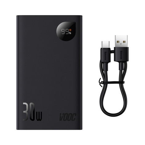 Specifikationer: - Mærke: Baseus - Model: Ppad050101 - Kapacitet: 20000 mah - Maksimal strøm: 30w - Hurtig indlæsning: SCP, Strømlevering, Hurtig opladning, FCP, AFC, Super VOC - Tilslutningstype: 2x USB (Output), USB Type C (Input og Output) - Indbygget LED-skærm - Farve: sort