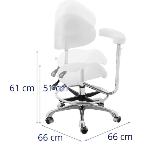 PVC Og giver ekstra komfort, ligesom en polstret armlæn. Sadelstolen er udstyret med en base med solide 5 hjul, der roterer med 360deg. Sædet roterer også med 360deg. Sædets højde er reguleret i området