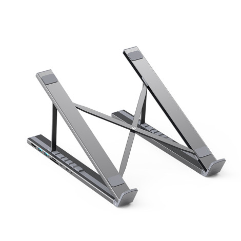1024264Laptop-Stand-Choetech Hub-M48 Ermöglicht das Einstellen eines Laptops im rechten Winkel. Am unteren Rand des Standes befinden sich zwei USB-Buchsen mit einer Bandbreite bis 5 GB / s, einer HDMI-Buchse, mit der Sie ein Bild in einer hochauflösenden 4K 30 Hz und drei USB-C-Buchsen anzeigen können. Der Choietech Hub-M48-Laptop-Stand hat auch einen SD- und TF-Karteneintrag.