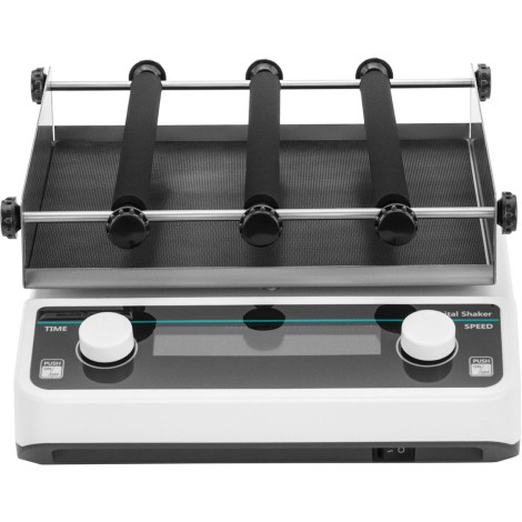 200 RPM. Anpassen der Intensität auf unterschiedliche Substanzen. Drei Rollen bieten viel Platz für Laborschiffe, z. B. Petrischalen, Becher, Flaschen, Blutsammeltaschen an