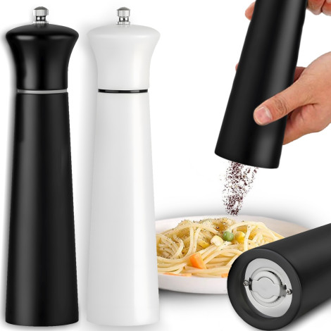 1029579Ein Satz von zwei Kunsthandwerkzeugen für Salz, Pfeffer und Gewürze Hergestellt aus Naturkautschukholz sind für jede Küche praktische und elegante Ausstattung. Mit klassischen weißen und schwarzen Farben können Sie den Inhalt der Mühlen leicht unterscheiden, und die solide Konstruktion garantiert Haltbarkeit und Gebrauchskomfort.
