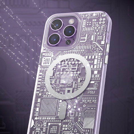 Διαφανής υπόθεση για smartphone Είναι εμπνευσμένο από την υφή της πλακέτας τυπωμένου κυκλώματος. Κατασκευασμένο από ένα στερεό πλαστικό, προστατεύει αποτελεσματικά τη συσκευή από τις επιδράσεις των πτώσεων. Υποστηρίζει την τεχνολογία Magsafe, χάρη στην οποία είναι δυνατή η ασύρματη φόρτωση. Τα μεταλλικά κουμπιά σε αντίθεση με το χρώμα κάνουν αυτή την περίπτωση να φαίνεται πολύ μοντέρνα. Το κάλυμμα συνδυάζεται με