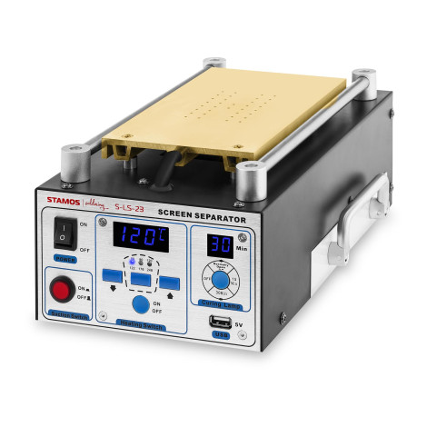 10020145 Μάρκα διαχωριστή LCD Stamos Soldering Θα εργαστεί σε επισκευές οθονών αφής εξοπλισμού έως 8 ίντσες, π.χ. ταμπλέτες και τα smartphones. Το μοντέλο S-LS-23 είναι εφοδιασμένο με πλάκα αναρρόφησης κενού (14 W, 0,05 MPa) για να εξασφαλιστεί η σταθερότητα κατά τη λειτουργία. Η θερμοκρασία ρυθμίζεται σε 3 τρόπους για να διαλέξετε από: 50, 80 ή 120deg C. Η συσκευή έχει θύρα USB 5V και συρτάρι με λαμπτήρα UV, η οποία χρησιμοποιείται για τη θεραπεία οθονών. Ένας ευανάγνωστος πίνακας ελέγχου έχει παρασχεθεί με οθόνες LED.