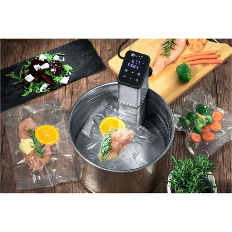 Κωδικός κατασκευαστή: 10011738 SOUS VIDE κυκλοφορία μάρκας Royal Catering Σας επιτρέπει να μαγειρεύετε απαλά τα τρόφιμα ως προς ένα λεπτό σε μια σταθερή θερμοκρασία. Λόγω του συμπαγούς σχήματος και της εύκολης προσαρμογής για δοχεία κατσαρόλας και τροφοδοσίας, ο εξοπλισμός είναι κατάλληλος για εμπορική χρήση σε εστιατόρια, μπιστρό ή ξενοδοχεία, αλλά και για ιδιωτική χρήση στο σπίτι. Το μαγείρεμα κενού επιτρέπει τη λεπτή και ακόμη και την προετοιμασία διαφορετικών πιάτων. Ανεξάρτητα από το αν είναι λαχανικά, κρέας, θαλασσινά, ή ακόμα και σούπα - τα τρόφιμα διατηρούν ένα φρέσκο άρωμα και έντονη γεύση κατά τη διάρκεια της διαδικασίας μαγειρέματος χάρη στην κλεισίματος σε σακούλες κενού. Το Rondel ή το δοχείο θα πρέπει να γεμίζεται με νερό (20-30 L) και να γάντι ενός κυκλοφορητή στην άκρη του δοχείου. Η βίδα ρύθμισης παρέχει καλή εφαρμογή. Στη συνέχεια, ορίστε τη θερμοκρασία και το χρόνο μαγειρέματος. Και οι δύο τιμές μπορούν να ρυθμιστούν με ακρίβεια χρησιμοποιώντας το διαισθητικό πίνακα αφής από Οθόνη LED από άποψη 5-90deg c Με ακρίβεια 0,5deg C. Η συσκευή θερμαίνει αυτόματα τη λουτρό νερού χάρη στον θερμαντήρα 1500 W. Το νερό ρυθμίζεται για να εξασφαλιστεί μια σταθερή θερμοκρασία. Απλά βάλτε στο πιάτο με φαγητό. Ο χρόνος μπορεί να ρυθμιστεί με έναν θερμοστάτη στην περιοχή 0-99 ώρες. Μετά την καθορισμένη ώρα, ο κυκλοφορητής για το μαγείρεμα Sous Vide απενεργοποιείται αυτόματα. Αυτό δίνει τον έλεγχο της διαδικασίας μαγειρέματος. Product features: