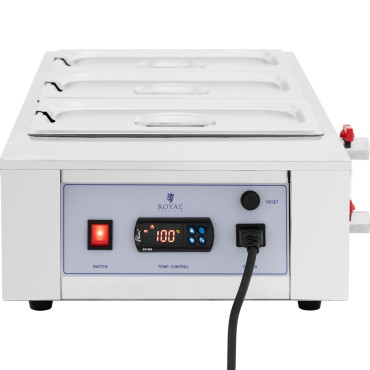 10012775 Mark chocolate heater Royal Catering Suitable for professional catering companies. The device allows for a quick solution of chocolate and maintains a liquid mass in the heat. Thanks to liquid chocolate, you can prepare a lot of delicious creations (topping for ice cream and cakes, chocolates, cupcakes, brownie ...). High quality device has three bath tubs with a capacity