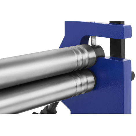 310mm and 1mm thick. Manual crank allows you to rotate the roll while inserting a sheet metal sheet metal. Rubber, non-slip handle provides work convenience. The knobs adapt the distance between rollers to the thickness of the material. The upper roller allows you to quickly remove the finished element and facilitate maintenance. The device can be mounted into the substrate thanks to holes in the base. It is possible to apply flat rolling for a soft steel, as a result, a flattened sheet or slightly reduced thickness is obtained. The roller is also suitable for making arcs with a fixed radius and cylinders. The maximum material thickness is 1 mm. Thanks to grooves on shafts, the sheet rollers also forms a rod, wire or a small pipe with a diameter of 8 mm, 6 mm and 4 mm.
