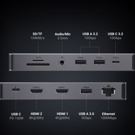 El kit incluye: - - Adaptador USB-C de HUB 13W1 - USB-A / USB-C / HDMI / DisplayPort / RJ45 / SD TF / AUX / USB-C PD - GRIS