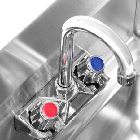 10010510Un lavabo profesional se ha diseñado especialmente para su uso en puntos de catering, oficinas, tiendas y donde sea alta higiene y facilidad de mantenimiento de la limpieza. El fregadero tiene paredes altas que protegen contra salpicaduras de agua. La alta calidad hecha de acero inoxidable pulido facilita la limpieza y protege el lavabo contra daños. El conjunto es de alta calidad, un grifo móvil con todos los elementos necesarios. El lavabo está adaptado para montar en la pared.