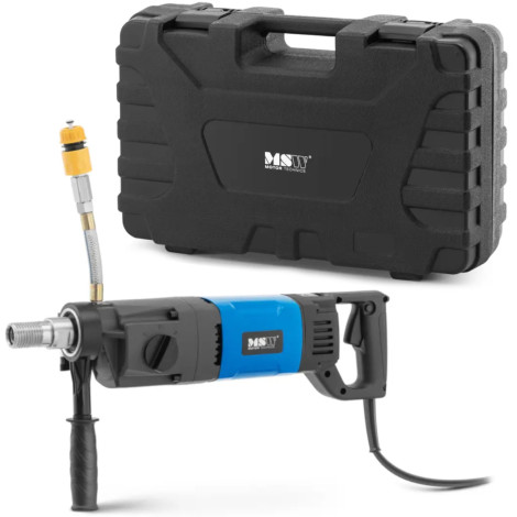 a un diámetro de 100 mm. Para obtener los mejores resultados, use dos niveles de potencia, así como use los taladros con el diámetro más grande a la velocidad más baja. El dispositivo tiene una función de enfriamiento de agua durante la perforación. El conector está integrado directamente con el dispositivo. Este consumo de perforación reduce, limita el mantenimiento de la máquina y proporciona una vida más larga. Para reemplazar los cepillos de carbón, simplemente retire la cubierta protectora. Los taladros de núcleo de diamante con diferentes diámetros se sujetan de forma segura en el dispositivo usando el asa. El taladro de diamante se puede perforar en concreto reforzado, cemento, pared, asfalto y piedra natural. Cuerda de alimentación