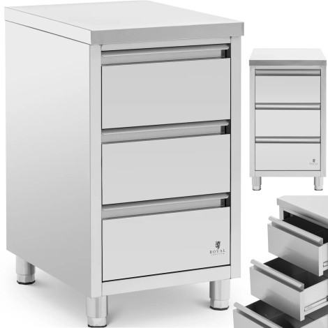 50 x 60 x 87 cm. Reguleeritavad jalad võimaldavad teil igal pinnal seadistada mööblit. Kolm sujuvalt töötavat sahtlit pakuvad palju ruumi tarvikute või koostisosade hoidmiseks. Suured integreeritud käepidemed muudavad need lihtsamaks avamiseks ja sulgemiseks. Kõik elemendid tehti kõrge kvaliteediga roostevabast terasest, mis on ette nähtud toiduga kokkupuutumiseks.