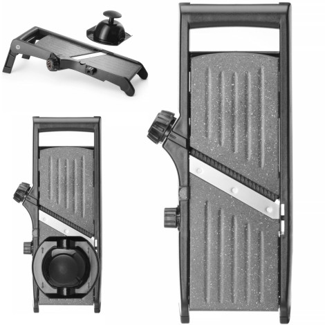 Mandolin on varustettu lisää, sisäänvedettävä, leveä jalka. Kiitos sen, voit pyyhkiä vihanneksia pitäen mandolin kädessäsi tai asettaa sen 45deg-laskuriin.