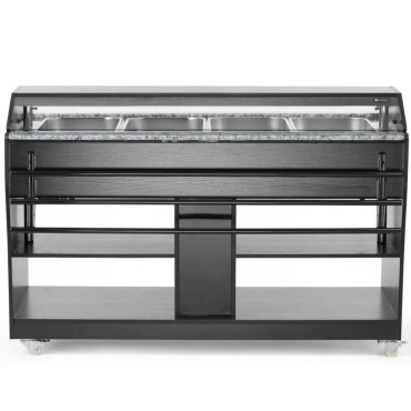 4 GN 1/1 astiat, joiden suurin syvyys on 150 mm. Puolella on hyllyjä levyjen ja ruokailuvälineiden varastointiin. Kotelo oli valmistettu ruostumattomasta teräksestä mustalla puisella vanerilla. Lämpötila on säädettävissä alueella