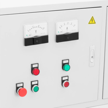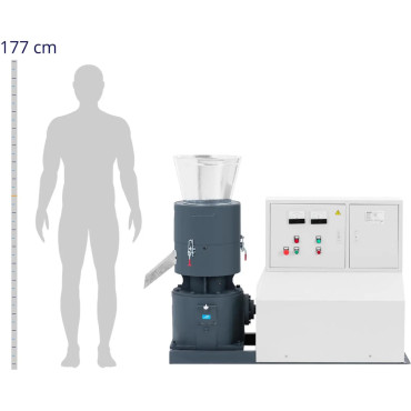 Halkaisija 400 mm. Tämän seurauksena voimakkaasti tiivistetyt, kestävät pelletit, joiden halkaisija on 6 mm. Jos haluat tuottaa pelletin, jolla on eri halkaisija, tarvitaan muita matriiseja. Poistiokaukolla voit täyttää pussien valmiit pelletit. Ohjauskaappi on läpinäkyvä ja intuitiivinen käyttää. Hätäkytkin takaa turvallisuuden. Metolitsikäyttäjällä on sähkömoottori