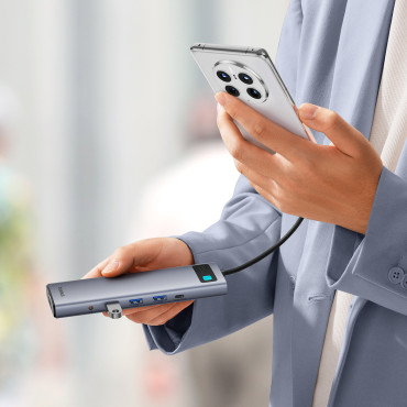 Kompakti muotoilu, liikkuvuus ja helppokäyttöisyysKompaktin kokoisen ja integroidun rakenteen ansiosta napa on helppo kuljettaa, mikä tekee siitä ihanteellisen ratkaisun aktiivisille ihmisille, jotka tarvitsevat matkapuhelimen telakointiaseman täydellä ominaisuuksilla.