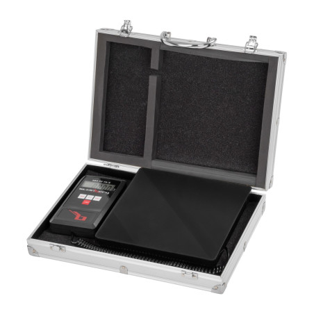 La balance est fournie avec une solide et pratique valise de transport qui sert également à ranger la balance. La balance et le terminal fonctionnent avec une batterie de 9 V.