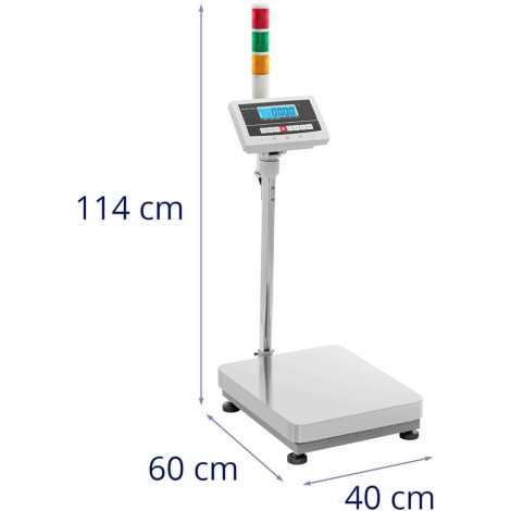 Lampe de signalisation à 3 couleurs À première vue, vous pouvez voir si la masse est trop faible, trop élevée ou en termes de tolérance. Pour ce faire, les limites des limites doivent être définies. Grâce à cela, le poids comparait constamment la masse actuelle, puis montre le signal approprié pour dépasser, non-structure ou tolérance. L'équipement dispose d'un panneau de commande avec un écran LCD. La hauteur des chiffres de l'écran est de 27 mm, lisez-la facilement. Le poids est alimenté