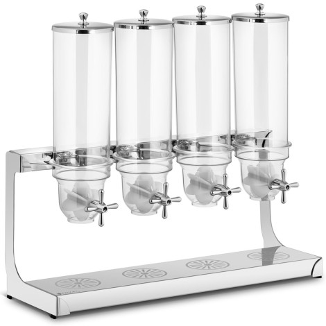 10011388Distributeur de céréales de la marque Royal Catering sera idéal dans le secteur HoReCa, dans les restaurants, hôtels ou bistrots, ainsi que partout où des petits déjeuners sont servis sous forme de buffet. Il permet de stocker et de doser des produits en vrac tels que des céréales, des biscuits, des gâteaux, des bonbons, des noix, des fruits secs, du café, du riz, etc.