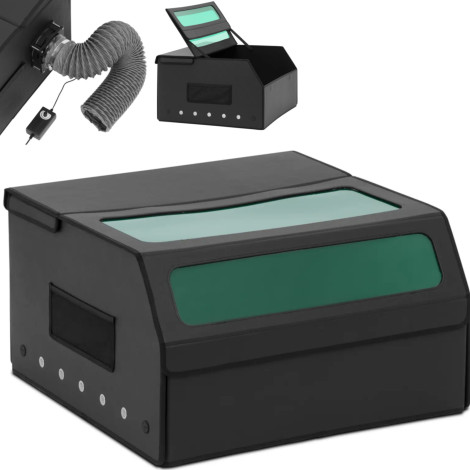 Système d'aspiration fuméequi est libéré pendant l'opération de la machine. Un ventilateur et un ventilateur de 1,9 m et une poussière et des molécules de fumée retirent les molécules de l'intérieur de manière contrôlée. Cela améliore la visibilité à l'intérieur du boîtier et protège contre les vapeurs nocives. La conception du bouclier pliable facilite le transport et le stockage. Les dimensions correspondent à la gravure au laser