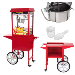 un point de vente très attrayant et impressionnant pour le POPCORN. Le chariot est équipé de deux grandes roues solides et de deux plus petites avec freins, ainsi qu'un placard pratique pour les ustensiles et le stock de maïs.