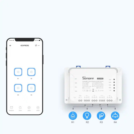 1017009Relais intelligent Wi-Fi Sonoff 4ChR3 compatible avec de nombreux appareils différents. L'interrupteur et les périphériques connectés à celui-ci peuvent être utilisés à distance par l'application EWelink (Android / iOS).