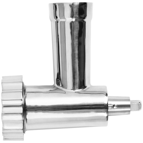 10012183Accessoire de hachage de viande de la marque Royal Catering idéal pour élargir les applications des mixeurs planétaires RCPM-7,1D et RCPM-7,1C. L'accessoire est adapté pour produire ses propres hamburgers, charcuteries et autres produits carnés. Le grand plateau à viande de 20,9 cm de diamètre et le poussoir en plastique facilitent considérablement le travail. À chaque rotation, la viande est poussée à travers le vis sans fin jusqu'à la lame en croix, et enfin pressée à travers le tamis. Les orifices de 4,5 ou 6 mm permettent d'obtenir une masse hachée uniformément. Tous les éléments, à l'exception du poussoir, sont en acier inoxydable.