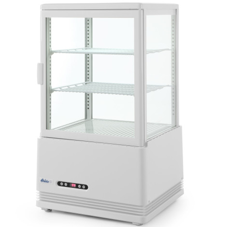 Numer de fabricant : Hendi 233610 Vitrine réfrigérée réglable de couleur blanche. Caractéristiques du produit : – double vitrage avec portes battantes facilement ouvrables – canal d'air à l'extérieur du verre pour éliminer et prévenir la condensation de la vapeur d'eau – boîtier en acier inoxydable peint – éclairage intérieur dans le plafond – étagères en acier réglables, revêtues de PVC – affichage numérique, thermostat électronique – refroidissement par ventilation avec dégivrage automatique – plage de températures : 2 à 6˚C – réfrigérant : R600A – classe climatique : N (+16°C - 32°C) Paramètres : – capacité en l : 58 – dimensions en mm : 452x406x(H)816 – description/ caractéristique : blanche – puissance (W) : 170 – tension (V) : 230 Contenu de la livraison : – Vitrine réfrigérée réglable – Manuel PL