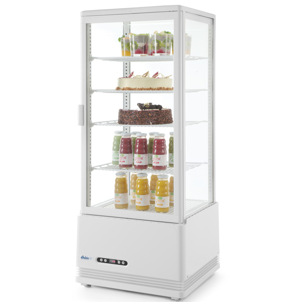 Numéro de fabricant: Hendi 233665 Vitrine réfrigérée à poser de couleur blanche Caractéristiques du produit : – double vitrage avec portes battantes facilement ouvrables – canal d'air à l'extérieur du verre pour éliminer et prévenir la condensation de la vapeur d'eau – boîtier en acier inoxydable peint – éclairage intérieur dans le plafond – étagères en acier réglables, revêtues de PVC – affichage numérique, thermostat électronique – refroidissement forcé avec dégivrage automatique – plage de températures : 2 à 6˚C – fluide frigorigène : R600A – classe climatique : N (+16deg C - 32deg C) – équipée de 4 étagères Paramètres : – capacité en l : 98 – dimensions en mm : 452x406x(H)1116 – description/ caractéristique : blanche – puissance (W) : 190 – tension (V) : 230 Contenu de la livraison : – Vitrine réfrigérée – Mode d'emploi PL