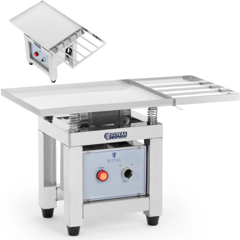 10012528Tablica vibracije Royal Catering Omogućuje vam da savršenu čokoladu učinite u trgovini ili pekanima. Uz njegovu pomoć, možete pouzdano kompaktati kokoa masu i izbjegavati zrak džepove. Zahvaljujući kompaktnom dizajnu, oprema se može postaviti na bilo koju radnu površinu. Zato je također pogodan za male čokolade i proizvođača slastice. Osim toga, izgradnja je vrlo jednostavna. Kontinuirana površina trese omogućuje brzo i jednostavno potresanje mjehurića zraka iz čokoladne mase. Na barovima, međutim, uklanja višak čokolade s kalupima dok stvarate ljusku. To daje željnu strukturu i stabilnost čokolade. Stol je izrađen od jake i higijenske