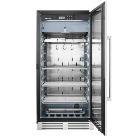 221433Garderoba za Hendi začin Nudi kontrolirano okruženje za meso meso, zahvaljujući kojem možete dobiti iznimno krhko i ukusno meso. Ormar je osmišljen kako bi savršeno reproducirao mikroklimu koja se koristi za tradicionalno, prirodno meso meso. U isto vrijeme, inovativna tehnologija omogućuje stalnu kontrolu nad procesom začina održavanjem stabilne ventilacije, podesivom vlažnost zraka i sterilizacijom.