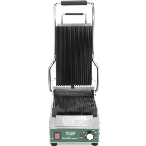 Wpg200eKontaktirajte roštilj Ima široku površinu od lijevanog željeza, koja vam omogućuje da se pripremite za čak 4 komada paninija. Također će raditi za tost burgera, povrća i drugih proizvoda. Zahvaljujući "tankom" dizajnu, ne uzima mnogo prostora nudeći maksimalne učinkovite rezultate rada. Kućište uređaja izrađeno je od satenskog nehrđajućeg čelika. Rebraste od lijevane željezne ploče imaju dimenzije