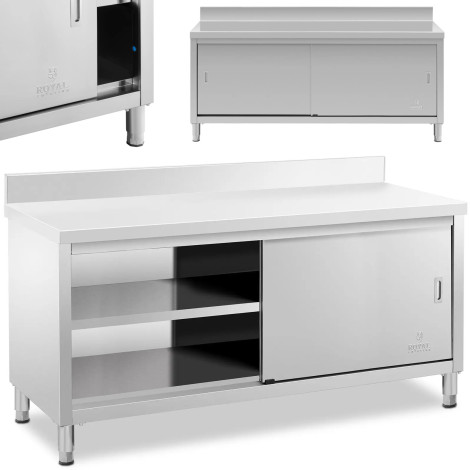 Radna tablica s markom ormarić Royal Catering Pruža dodatni prostor za rad i pohranjivanje posuđa i sastojaka za jela. Radit će u restoranima, hotelima, kantinama, kao iu bolnicama i prodavaonicama mesa. Unutra postoji kapipna polica koja pruža dodatni prostor za pohranu. Kabinet je zatvoren klizna vratakoji zauzimaju malo prostora, oni su sigurni za korištenje i pružaju jednostavan pristup unutrašnjosti. Rant štiti zid prije zatvaranja. Izvršenje nehrđajući čelik Pruža mnogo godina snage, otpor na oštećenja i izdržljive prljavštine. Mebel toleres Opterećenje na 600 kg.