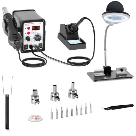 A készlet gazdag kiegészítőkészleteket tartalmaz: - - 2in1 forrasztóállomás (vezérlőmodul, Grotto forrasztó vas, forró levegő modul)