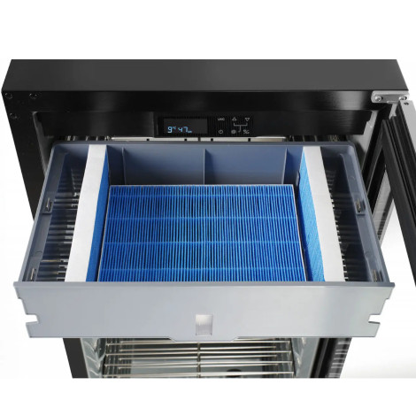 Az ajtó üvegezése 2 temperált üvegrétegből készült Alacsony szénsavas bevont, amely növeli a szekrény energiahatékonyságát az UV sugárzás blokkolásával és a hő belépésével. A desztillált víztartály ABS műanyagból készült - A vizet kézzel kell elvégezni.