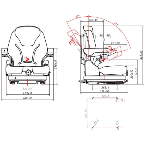- - állítható háttámla 30 - 75deg és az ülés 16,5 cm-rel mozog, és a fejtámla magassága 140 mm-rel állítható,