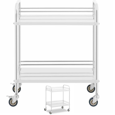 2 polcok méretekkel 63 x 40 x 12,5 cm. A három oldalon lévő keret megakadályozza a csökkenő dolgokat. Ugyanakkor egy oldal nyitva van, így könnyebb eltávolítani és lefektetni. 4 körből készült műanyag (ABS + PVC), amely különösen finom, még az érzékeny padlók esetében is. Két kerékpárnak van felszerelése. A trolibérlet rozsdamentes acélból készült, kapacitása 15 kg. Az alkalmazott anyag állandó és könnyen kezelhető.