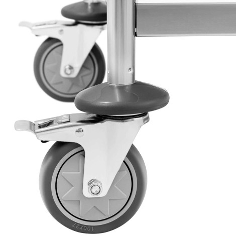 Parkoló fékek. Blokkolják a pincérnit a véletlen gördülések ellen. Szükség esetén a kerekek magassága 5 mm-rel állítható be. A kocsi higiénikus és korrózióállóságú