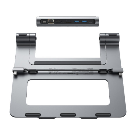 Többfunkciós cég állvány Acefast Beépített Hub amíg Nyolc csatlakozó: 2 x USB 3.0, 2 x USB típus C, HDMI, RJ45, TF és SD kártyaolvasó. Ez a többfunkciós eszköz kompatibilis a csatlakozók által szolgáltatott laptopokkal USB típus c. Gyors töltési protokoll is van Áramforrás a legfeljebb 100 w.