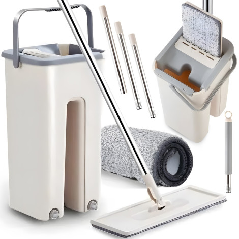 1029694Lapos mop kétkamrás vödörrel és integrált sajtoló rendszerrel Ez egy praktikus és ergonómikus eszköz minden típusú padló mosásához.