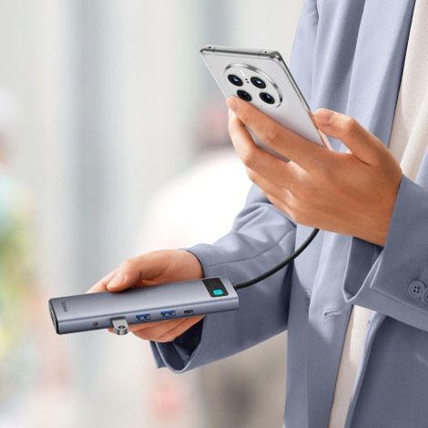Baseus Gleeam in metallo - Centro di intrattenimento moderno e versatile che soddisfa tutte le tue esigenze relative a connessioni multimediali. Grazie a vari porti, un alloggiamento in metallo leggero e funzioni uniche, questo dispositivo non solo facilita la vita, ma anche li rende più efficaci, offrendo un'esperienza unica quando si utilizza l'elettronica.