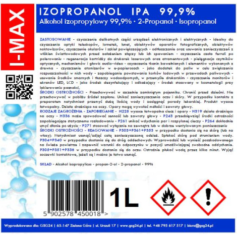 Nome del produttore: IPA I-MAX 1L Alcool isopropilico, isopropanolo, IPA Questa è una sostanza chimica professionale da alcoli organici con alcoli organici Excellent cleaning and degreasing properties E grazie alla rapida capacità di evaporazione è un solvente ideale. La - alcool isopropilicus - propano-2-ol - 2-propanolo - 99% Le caratteristiche isopropanoli più importanti - IPA