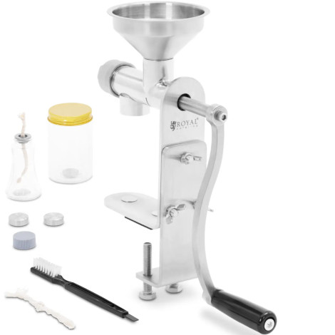 10013189Pressa manuale per la marca di pittura Royal Catering Ti permette di produrre oli freschi in breve tempo. La spremiagrumi è una grande proposta per le persone che si prendono cura della nutrizione che amano avere il pieno controllo sulla preparazione dei piatti. Dai dadi dadi, questa macchina per stampaggio dell'olio offre una vasta gamma di applicazioni ed è particolarmente adatta a vari cereali, semi e frutti con un contenuto di grassi di almeno il 25%. Per riscaldare la pressa dell'olio manuale (circa 7 minuti) e mantenerlo in caldo durante il funzionamento (circa 50 - 70Deg C), utilizzare la bottiglia in dotazione e riempirlo nel combustibile liquido dell'80%, utilizzare uno stoppino con una lunghezza di 15 cm. Inserirlo attraverso il foro in copertina in modo che sia fino a 5 mm, e il resto rimane in una bottiglia. Quando la macchina per la pressatura dell'olio raggiunge la temperatura richiesta, gradualmente posizionati grani o semi per un diametro di 105 mm e con una manovella ergonomica, premere l'olio che verrà raccolto al flacone allegato.