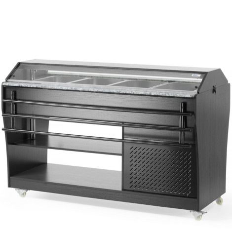 4 contenitori GN 1/1 con una profondità massima di 150 mm. Nella parte inferiore ci sono ripiani per la memorizzazione di piatti e posate. L'alloggiamento è stato realizzato in acciaio inossidabile con un compensato in legno nero. La temperatura è regolabile nell'intervallo