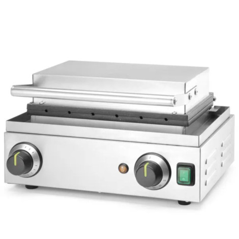 żłobienia na patyczki. Rynienka ociekowa na nadmiar ciasta ułatwia utrzymanie czystości stanowiska pracy. Regulacja temperatury następuje bezstopniowo za pomocą termostatu w zakresie od