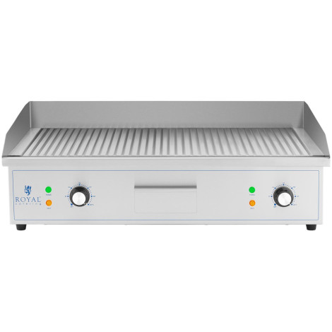 Płyta grillowa marki Royal Catering sprawdzi się do przyrządzania soczystych steków, hamburgerów, ryb, omletów, tortilli czy warzyw. Elektryczne urządzenie imponuje niskim wydzielaniem dymu oraz higienicznym i bardzo czystym sposobem pracy. Automatyczny termostat zapewnia utrzymanie stałej temperatury. Element grzewczy o mocy 4400 W szybko osiąga temperaturę roboczą w zakresie 50-300deg C, ustawianą za pomocą pokręteł. Płyta wykonana została z żeliwa, szybko przenosi ciepło na żywność a jednocześnie długo zachowuje wysoką temperaturę. Płyta o grubości 10 mm ma wymiary 700 x 400 mm. Ryflowana powierzchnia sprawia, że nadmiar tłuszczu spływa z mięsa i wędlin a wyjmowana szuflada umożliwia jego usunięcie. Osłona przeciwbryzgowa skutecznie chroni powierzchnie przed rozpryskami tłuszczu. Obudowę wykonano z wysokiej jakości stali nierdzewnej, odpornej na korozję, bezpiecznej dla żywności i łatwej w czyszczeniu. Antypoślizgowe nóżki zapewniają stabilność i nie rysują blatu.