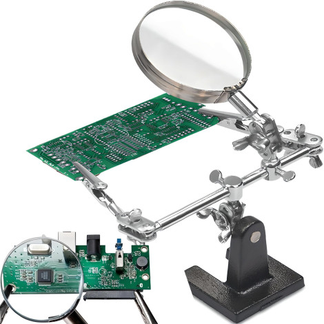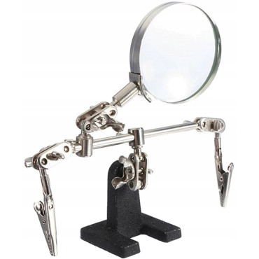 Kod producenta: 1029637 Lupa z uchwytem typu "trzecia ręka" marki RETOO to praktyczne narzędzie niezbędne przy precyzyjnych pracach takich jak lutowanie, modelarstwo, klejenie, naprawa zegarków czy biżuterii. Stabilna żeliwna podstawa i regulowane ramiona z krokodylkami umożliwiają wygodne i pewne przytrzymanie elementów oraz ustawienie lupy pod dowolnym kątem. Powiększenie 2,5x i duża soczewka o średnicy 62 mm zapewniają dobrą widoczność drobnych detali. Cechy produktu: