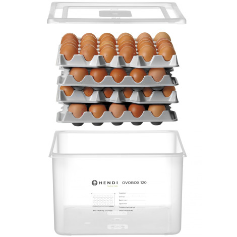 Pojemnik na jajka OVOBOX 120 firmy HENDI to praktyczne rozwiązanie pozwalające bezpiecznie przechowywać sterylizowane jajka i chronić je przed skażeniem salmonellą. Zestaw zawiera wytrzymały pojemnik, pokrywę i 8 tacek na jajka z możliwością piętrowania. Pojemnik mieści 120 jajek.